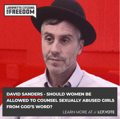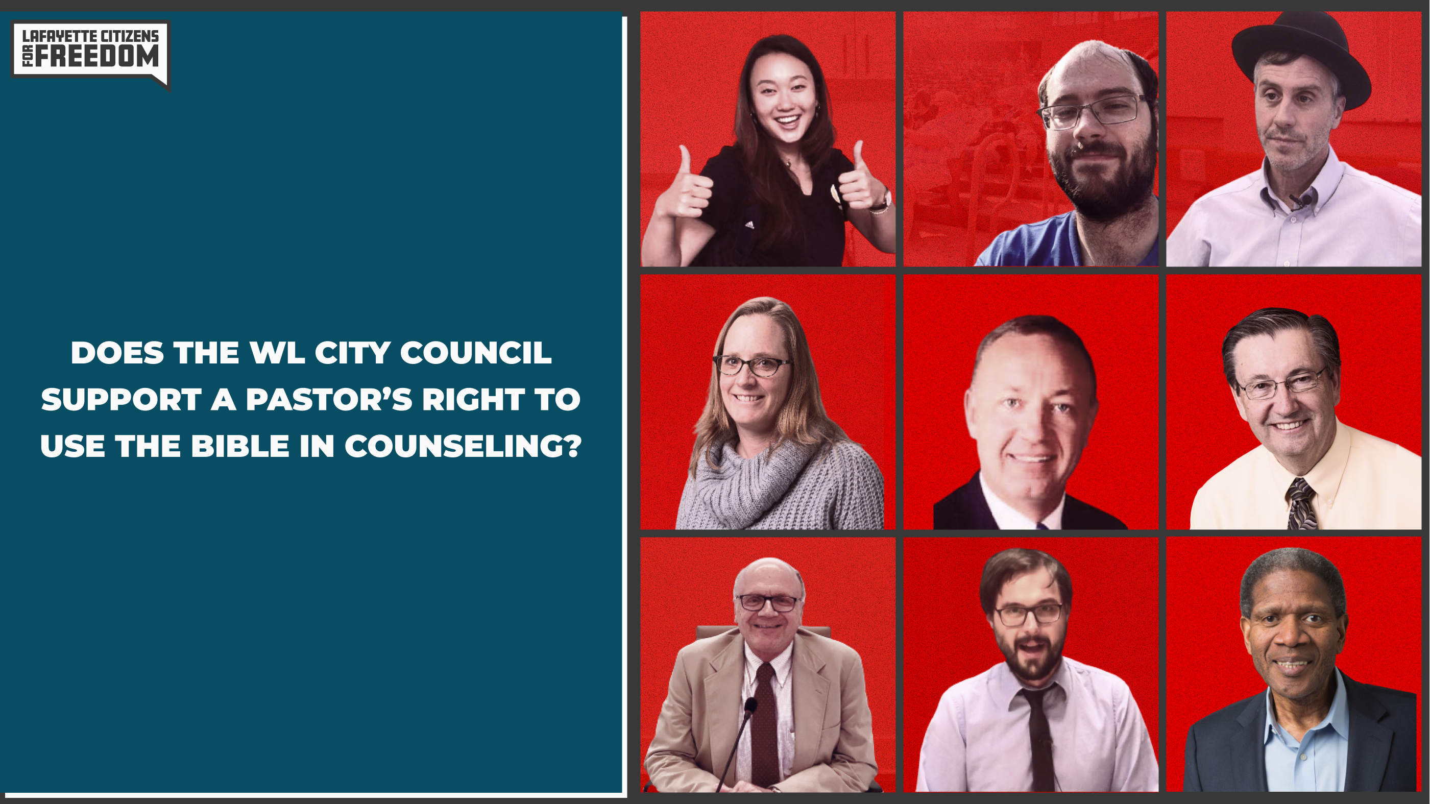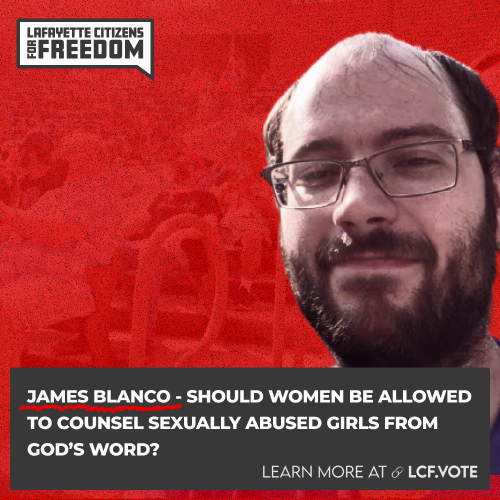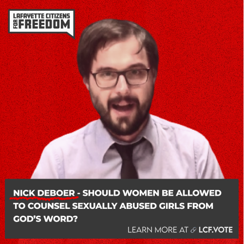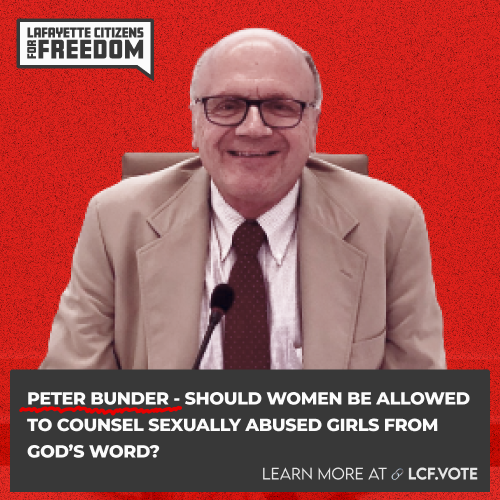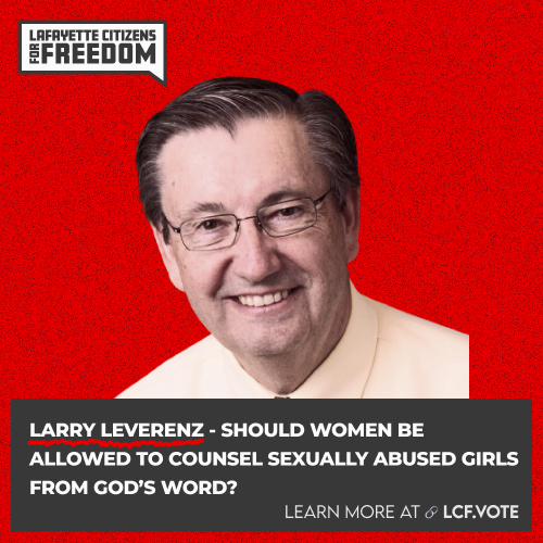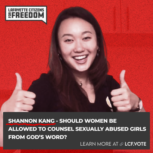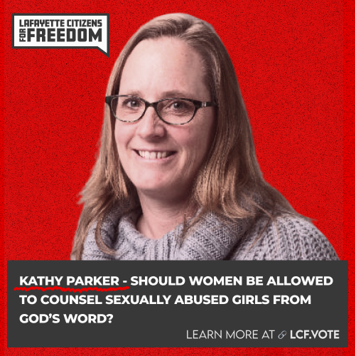 My name is Jocelyn Wallace, and I am an unlicensed biblical counselor and I have been asked by Lafayette Citizens for Freedom to speak today. Although I am unlicensed by the state of Indiana, I have been certified through the Association of Certified Biblical Counselors for the past 15 years.
